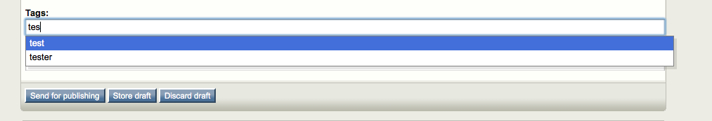 Adds an autocomplete feature on the Keywords datatype ( ezkeyword ) during content edition. Previously entered keywords will be shown in a suggestion drop down. It also makes sure an already picked up keyword is not picked again. It is based on YUI's Autocomplete component.